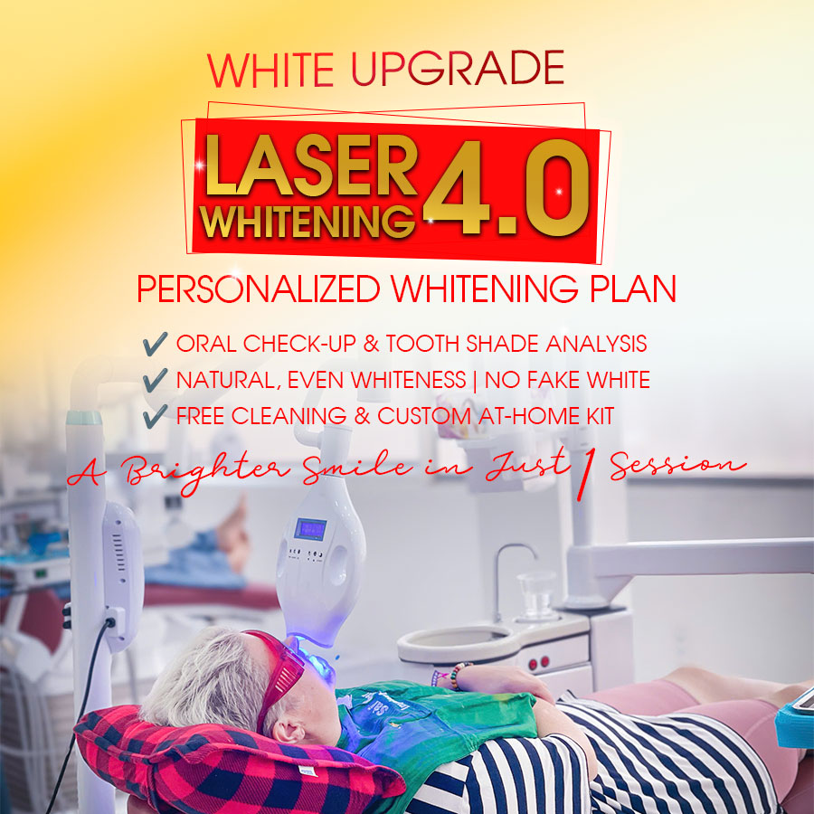 A modern 4.0 whitening laser is directed onto the gel to activate a chemical reaction. This process breaks down stains and discoloration, revealing the natural whiteness of your teeth from within